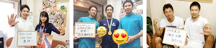 世界大会にて世界記録で金メダルを獲得した選手にも、お身体のメンテナンスの為、お通い頂いております。他にも、水泳の実業団で活躍するトップアスリートの方から、趣味でジョギングを